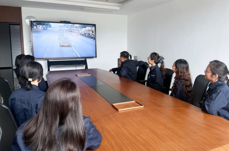 为让员工共同见证这一具有特殊意义的历史时刻,公司组织员工观看阅兵仪式。各车间和展厅全天播放纪念中国人民抗日战争暨世界反法西斯战争胜利80周年阅兵式直播和回放,确保每位同事都能参与到这一国家盛事中。