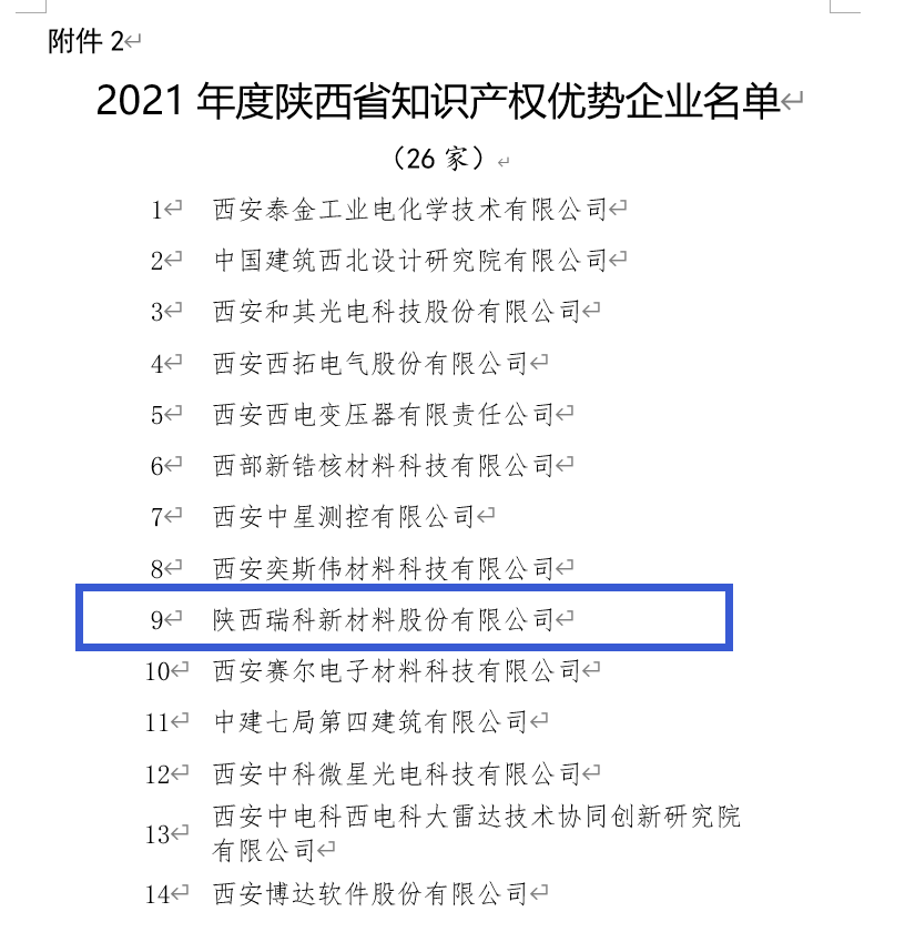 自陕西瑞科新材料股份有限公司成立以来,我们始终高度重视知识产权工作,通过制定知识产权战略、规划知识产权布局、强化知识产权运用、营造知识产权文化等工作,建立了扎实的知识产权制度。